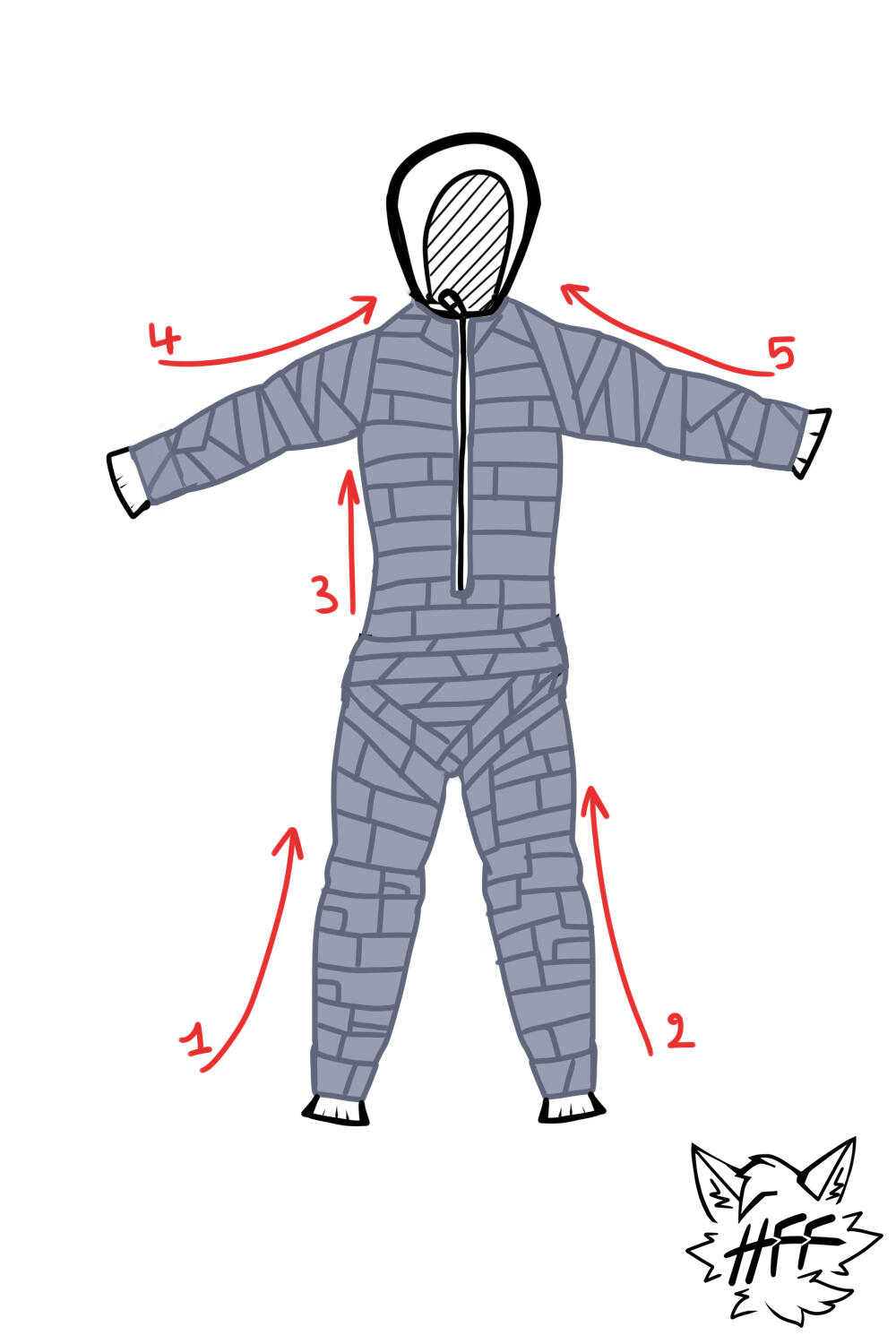 4) Une fois l'étape "3)" finie, vous pouvez vous attaquer aux autres parties du corps.TIPS : Commencez par les jambes, remontez sur le torse, en évitant de passer sur la fermeture éclaire du milieu, puis terminez par les bras en partant des mains jusqu'au cou.