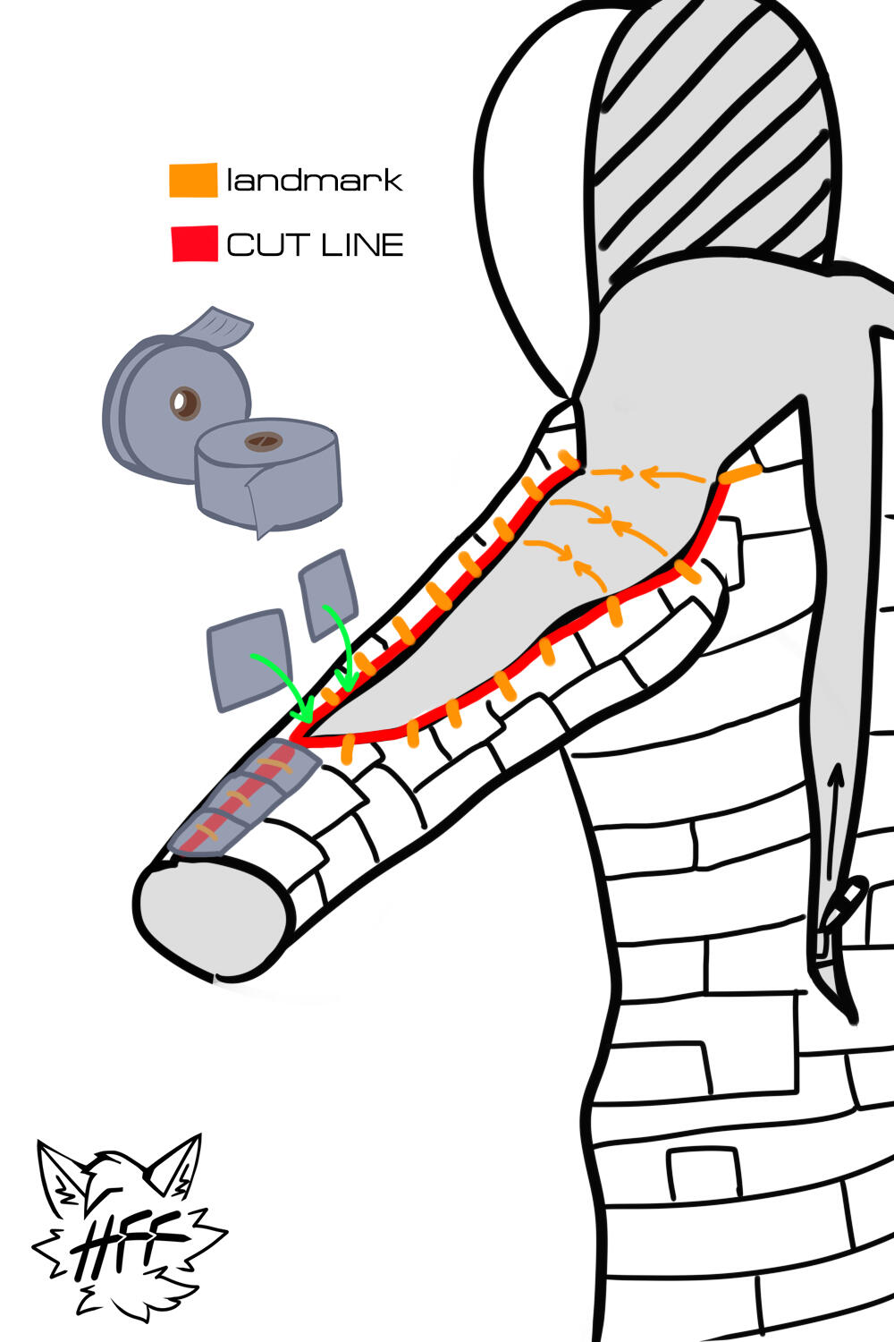 Cela fait déjà un moment que vous êtes enfermé, il faut vous libérer mais pas n'importe comment. Pour bien faire, il vous faudra faire d'autres marquages :-Un long trait qui partira en dessous de la main de votre choix jusqu'à tout en bas de la jambe, à ce trait vous y rajouterez des petits traits tout le long qui vous serviront à les réaligner lors de la reconstitution de la DTD.-Un autre trait qui partira de l'autre bras au dessus de la main jusqu'au cou, aussi avec des petits traits tout du long.