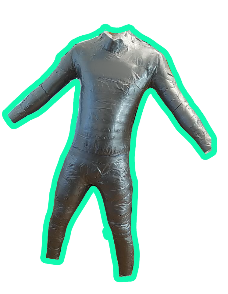 You will need to have 3 essential components:-Gray adhesive tape (Chaterton), it all depends on your body size but remember to take more or less 4 rolls of 25m to be sure.-A disposable painters outfit in your size, no need to take a larger size.-2 brooms or sticks to hold your arms in position, you will see why by following the tutorial.